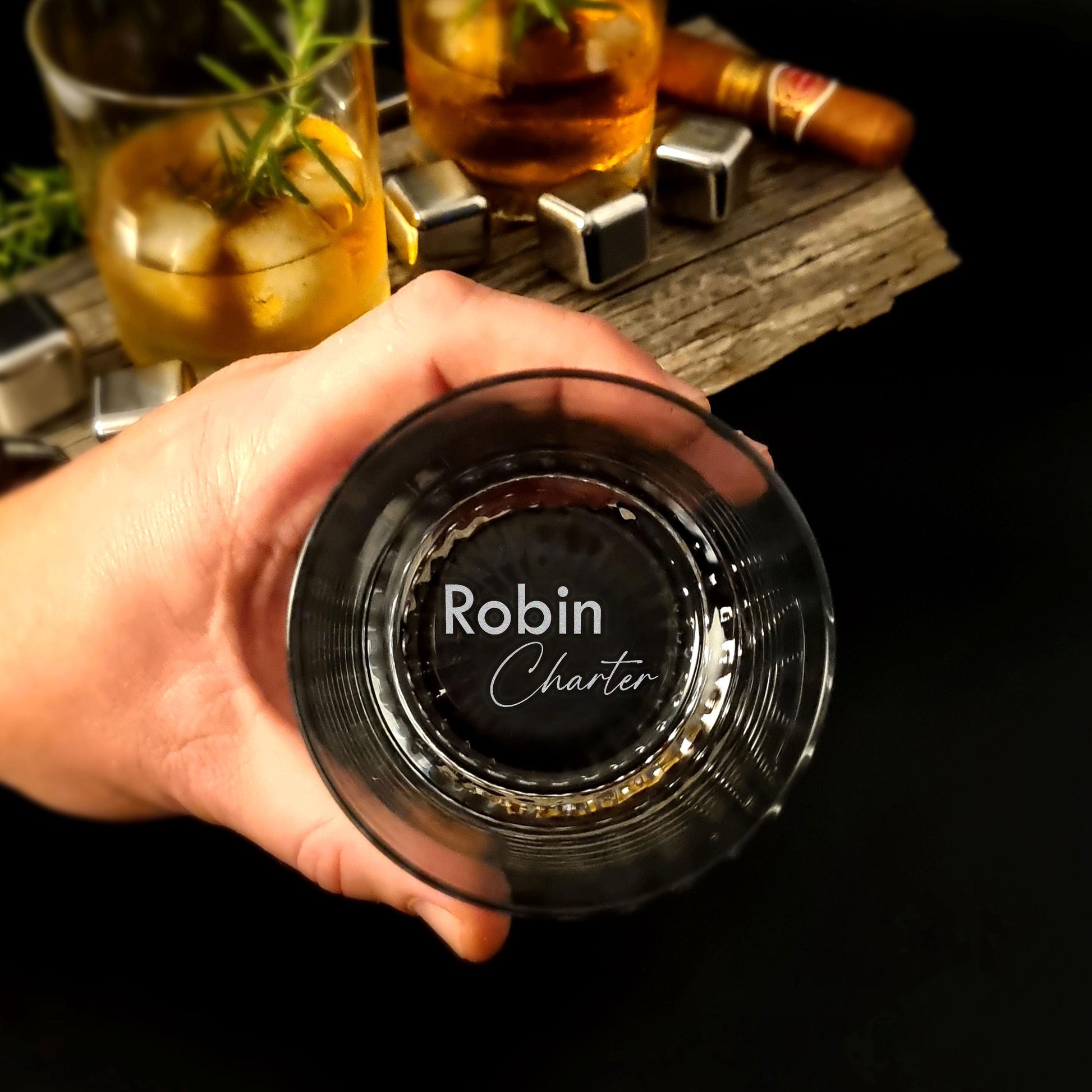 Personalized whiskey glass with engraved bottom initials—an ideal custom gift for him, perfect for groomsmen or any special occasion.