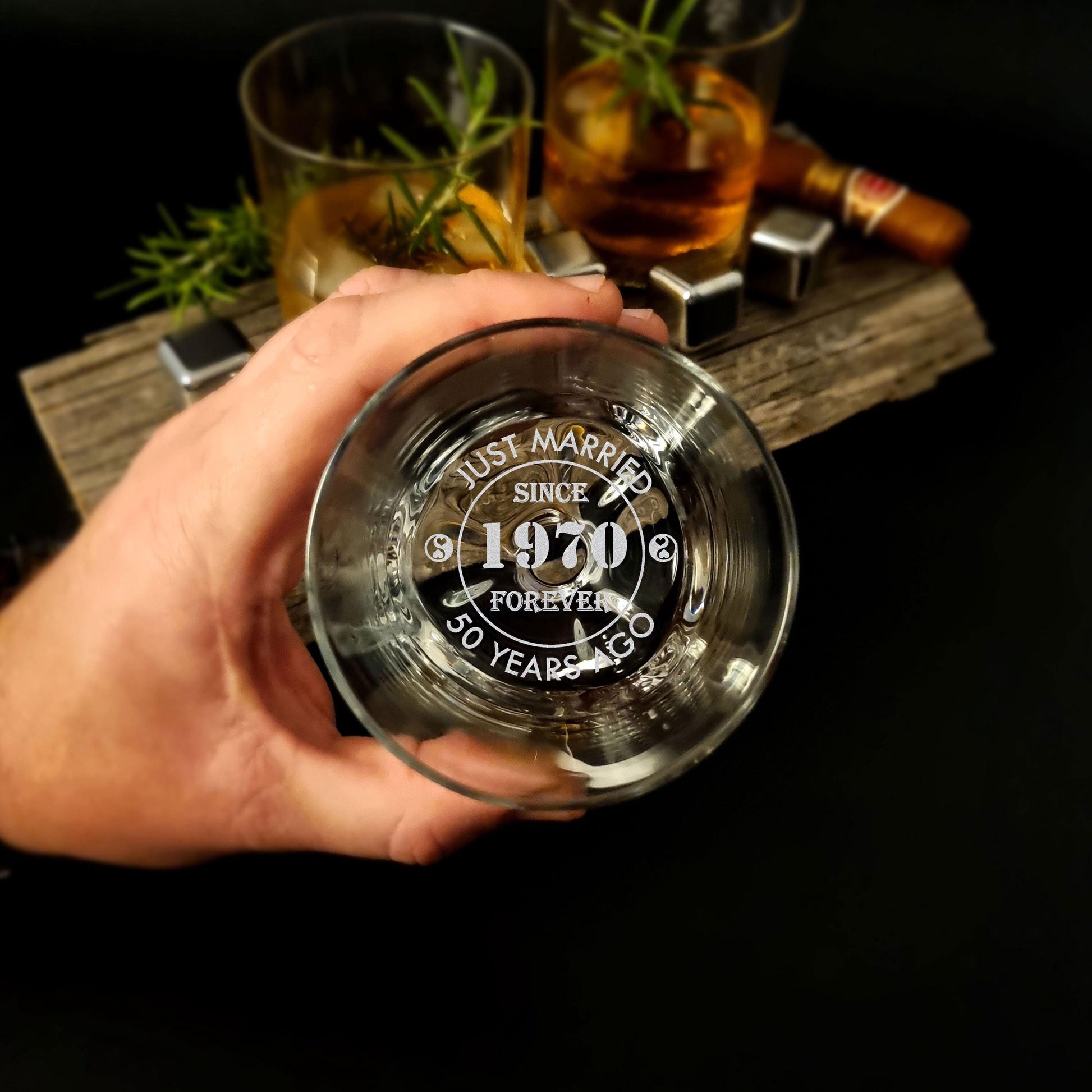 Custom anniversary whiskey glass engraved with your wedding date on the bottom— a personalized and meaningful gift for him, perfect for celebrating your special day.