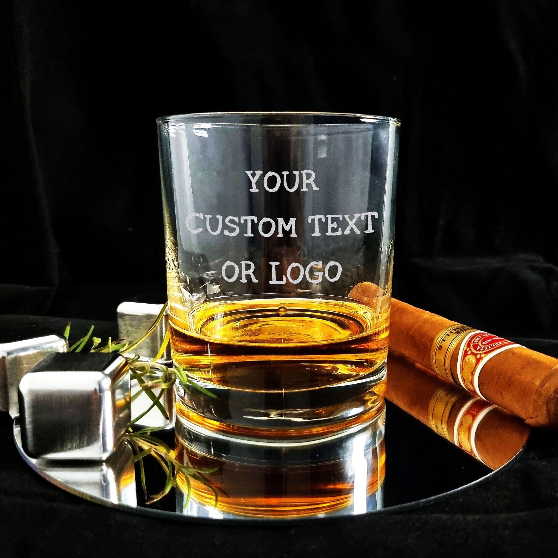 Make a statement with our personalized engraved whiskey glasses. Featuring any text or logo of your choice, these high-quality glasses are perfect for whiskey, cocktails, bourbon, and make a great groomsmen proposal gift. Create a unique and special touch to your drinks with our custom whiskey glasses today!