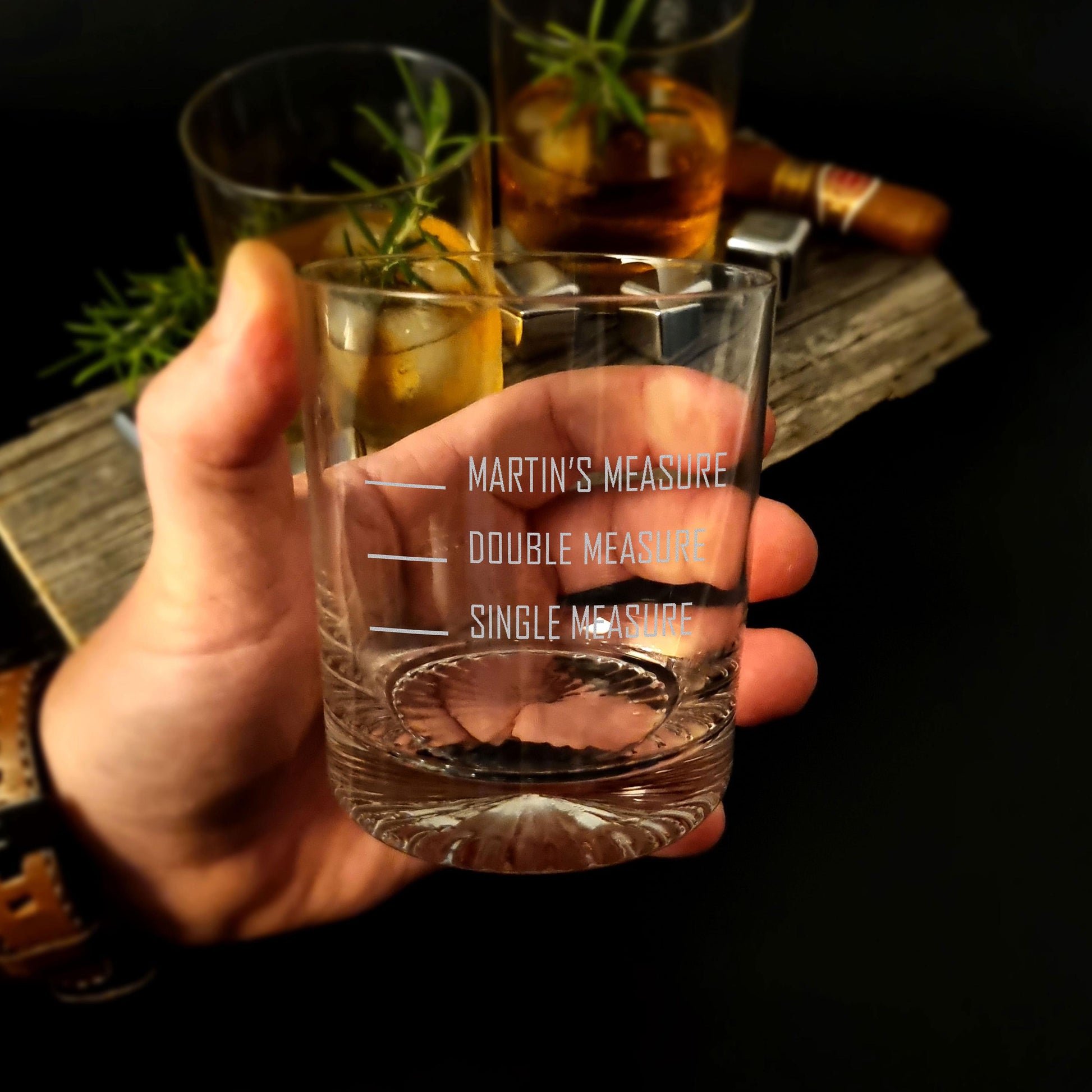 Funny personalized measuring whiskey glass with your custom name—an ideal gift for him on birthdays, holidays, Christmas, or any occasion for whiskey lovers.