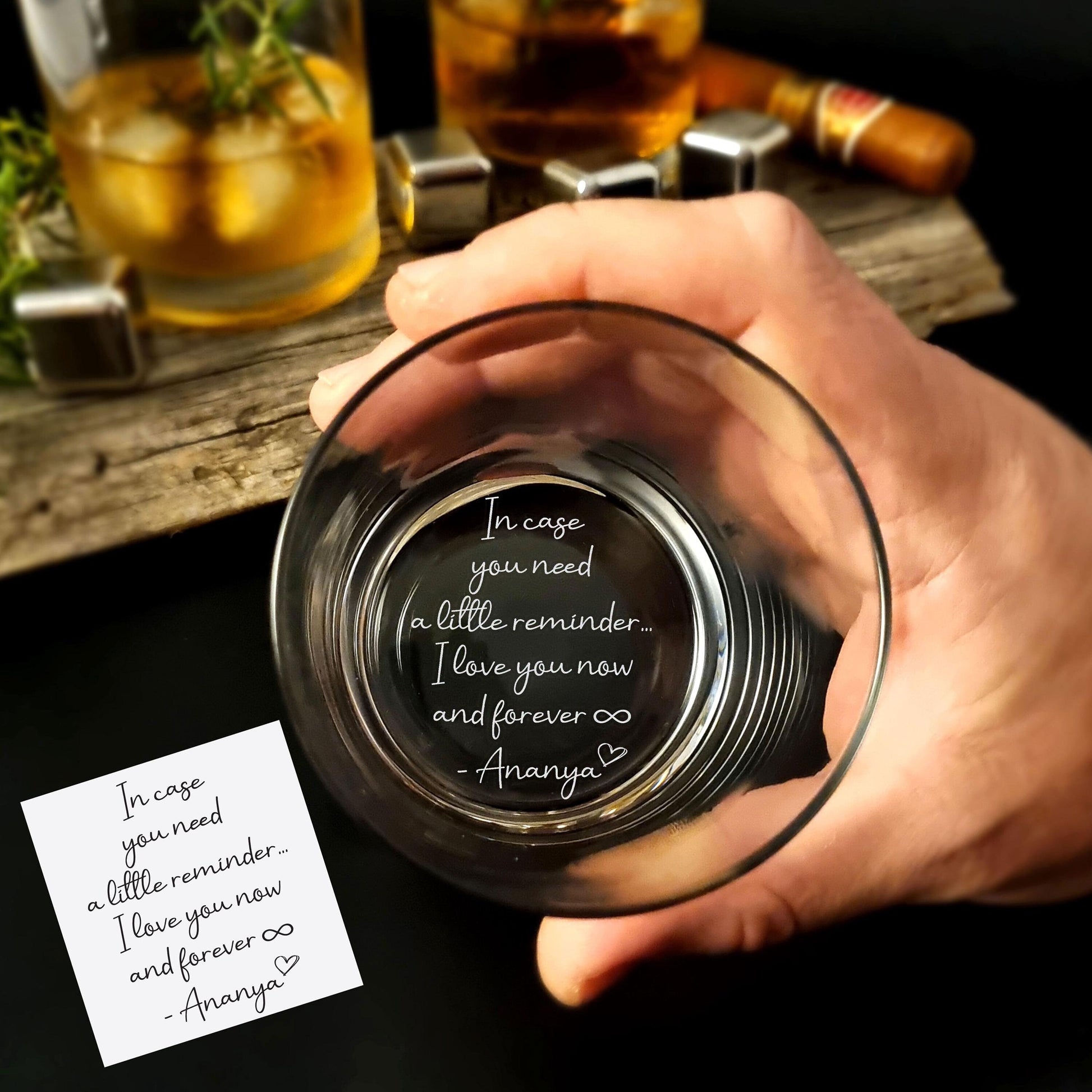 Handwritten anniversary gift crystal whiskey glass with custom bottom engraving — a unique and personalized gift for whiskey lovers, perfect for Dad, your husband, or any special man.