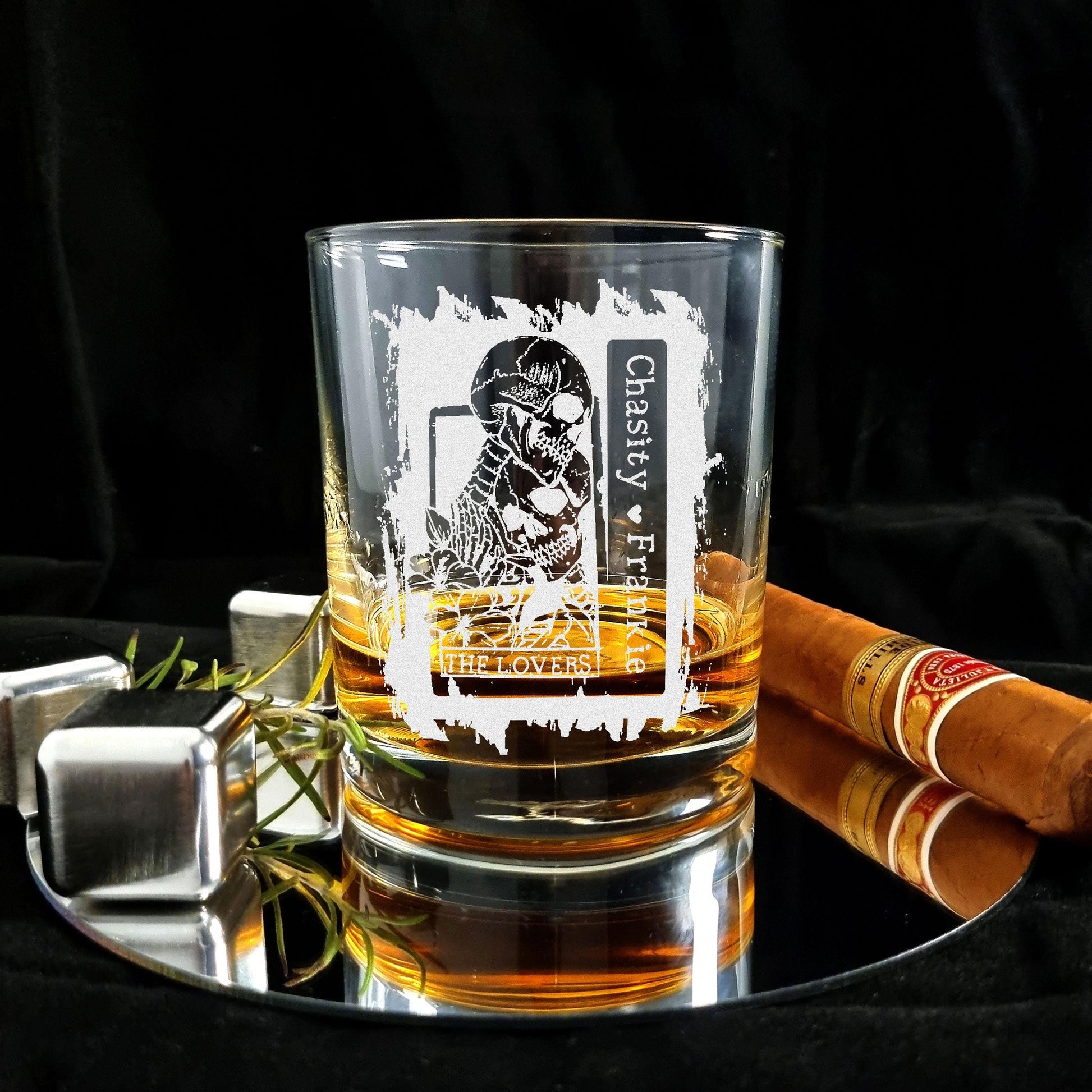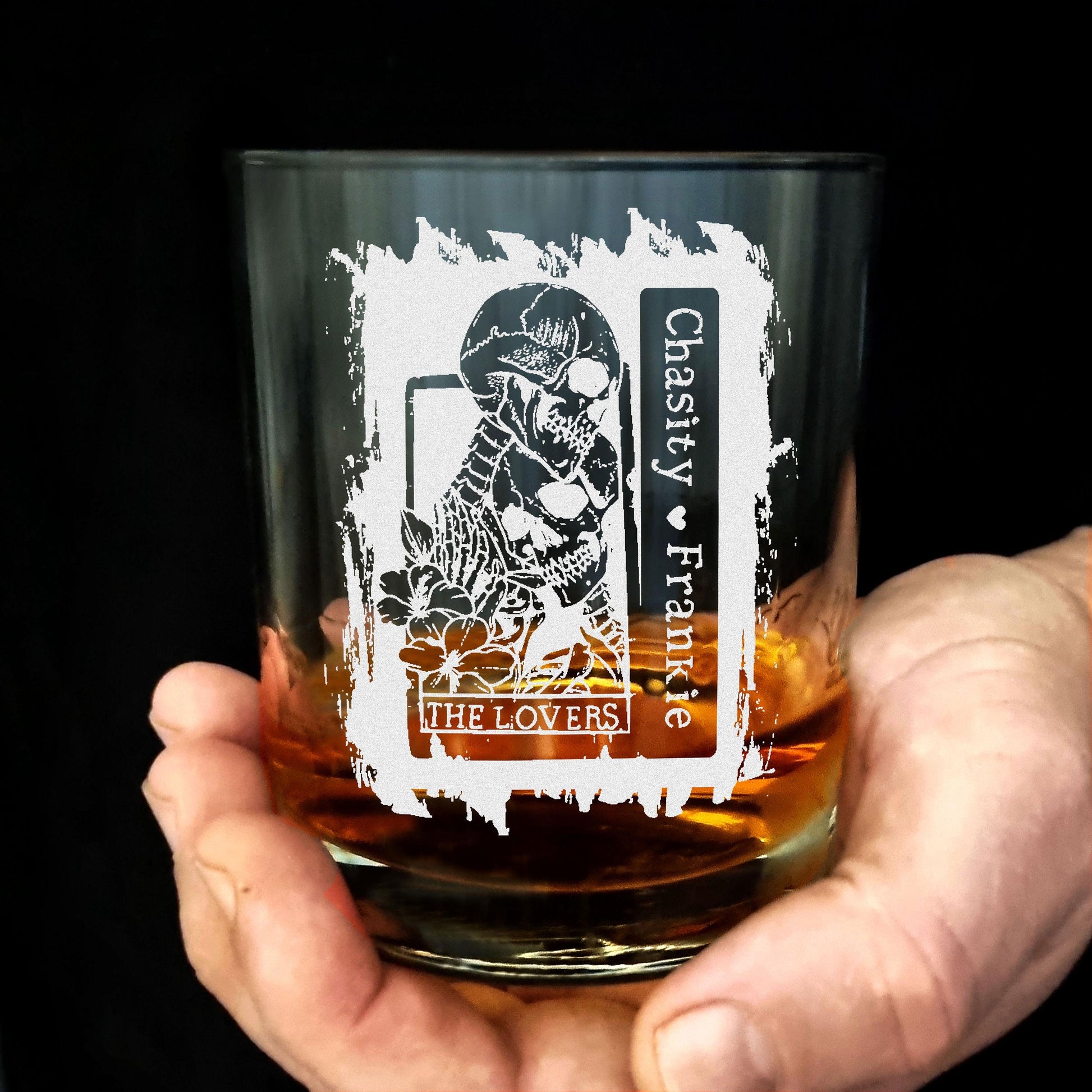 Personalized 'The Lovers' whiskey glass engraved with custom names—an ideal romantic gift for anniversaries, birthdays, or Valentine’s Day.